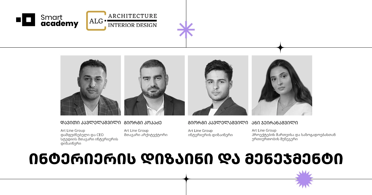 🤝 კურსი შექმნილია Smart Academy • სმარტ აკადემია-ისა და Art Line Group • არქიტექტურა და ინტერიერის დიზაინის კოლაბორაციით და გაძლევს რეალურ გამოცდილებას ინტერიერის დიზაინის სფეროში.